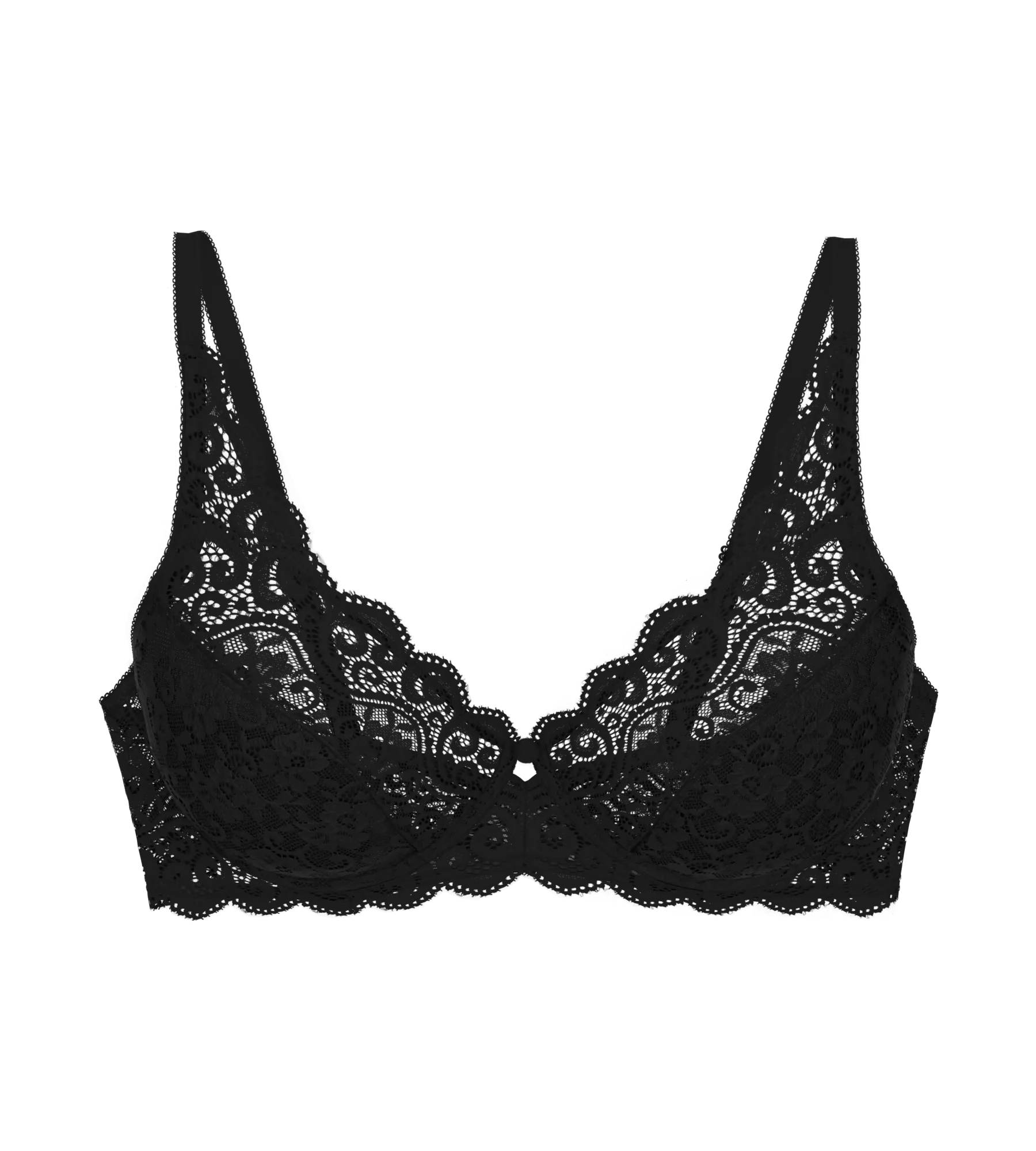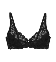 Seduction modern style is offered by this wonderfully comfortable Triumph bra in semi-transparent lace from the Amourette 300 line. This bra features: softly supportive semi-transparent cups in stretch lace, unpadded; lightweight, yet stable 3D shaper wires for ultimate support; exquisite floral embroidery on the delicate tulle cups; delicate lace trim on straps and sides; narrow adjustable straps; hook-and-eye fastener for optimum support, three width adjustments, nickel-free; and a small peephole and rose on narrow cradle. Accentuate your curves with matching briefs and on-trend colours from the Amourette 300 line.