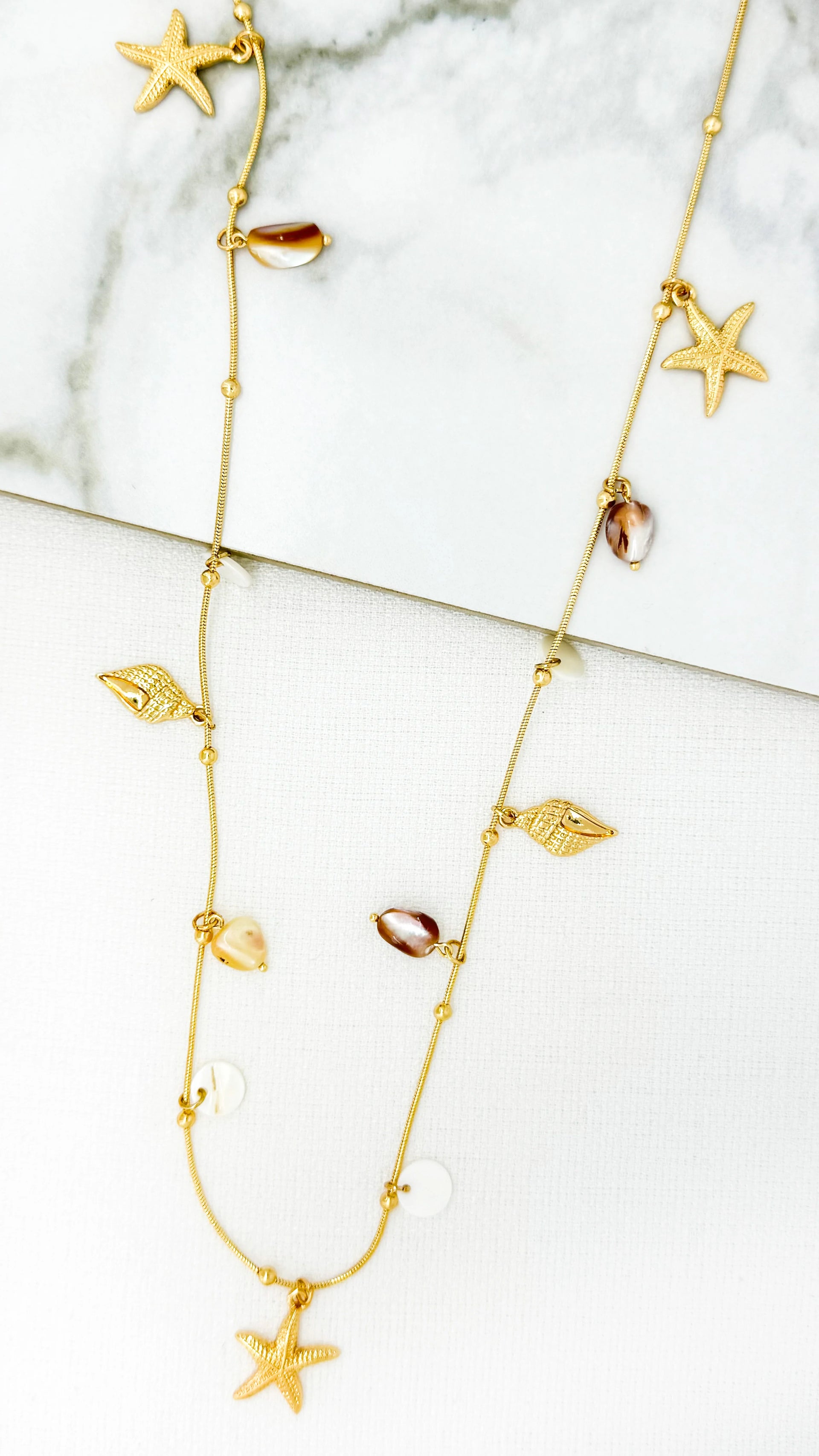 Bring effortless seaside elegance to your look with this long gold shell charm necklace, designed with delicate chain detailing and ocean-inspired accents. Featuring starfish and shell charms combined with natural-toned beads, this necklace creates a relaxed yet refined coastal aesthetic perfect for summer styling.
