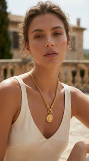 A sophisticated gold necklace that blends timeless charm detailing with clean, modern design — an effortless way to add polish and interest to any outfit.