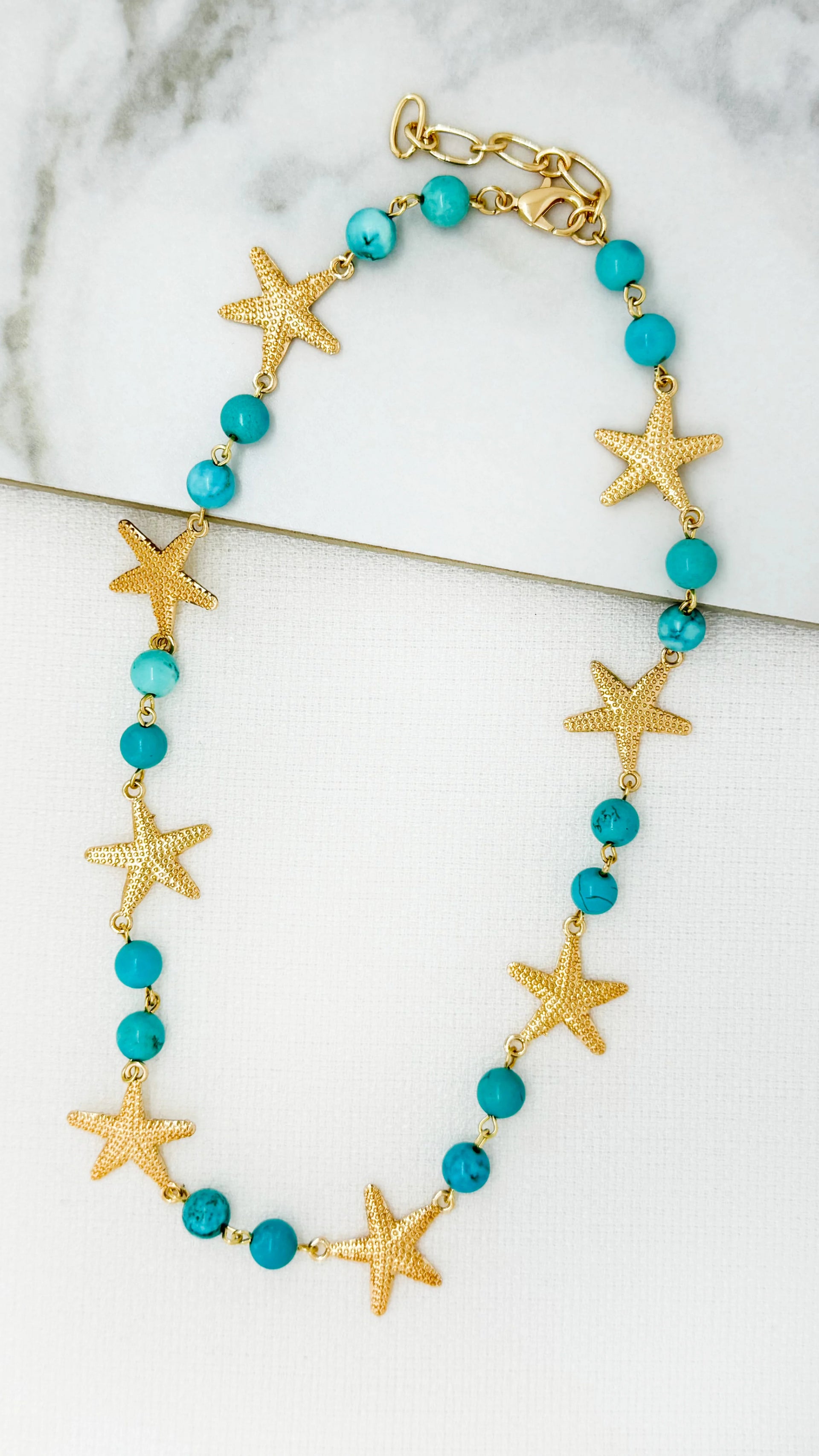 Short Turquoise Bead Necklace with Gold Starfish Charms – Coastal Statement Jewellery