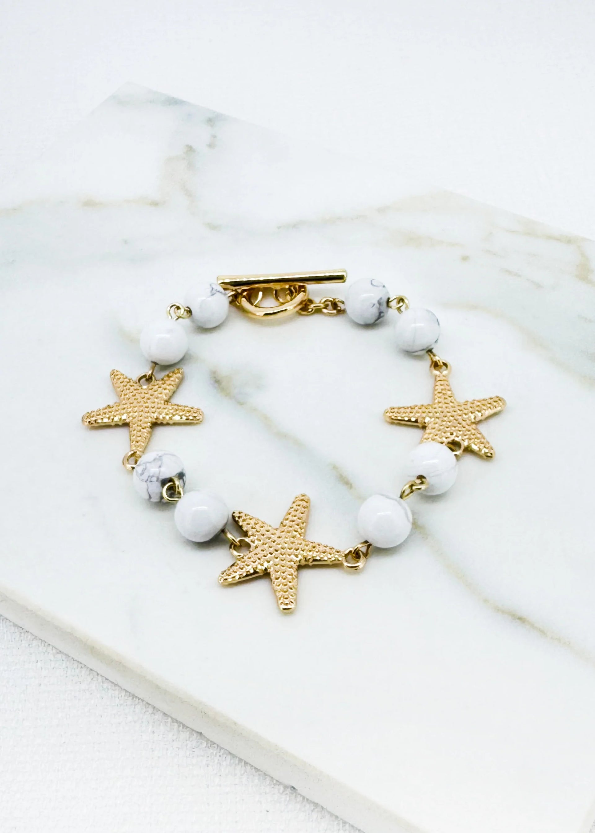 White Marble Bead & Gold Starfish Charm Bracelet – Coastal Style Jewellery