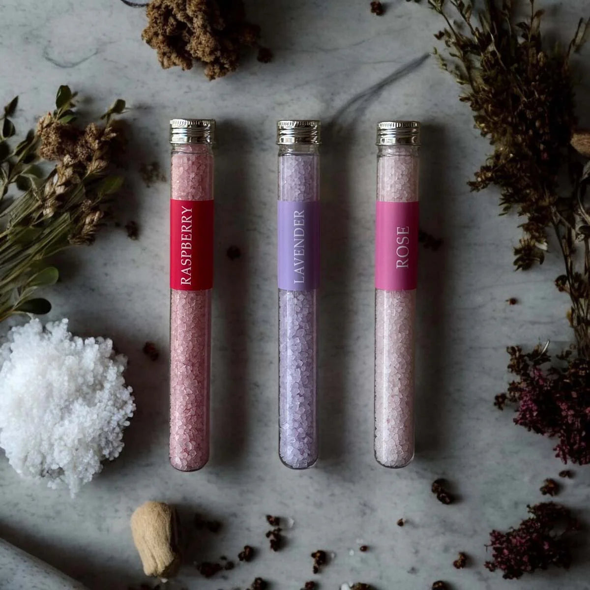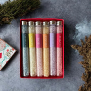 Set 6 assorted bath salts: LEMON, ORANGE, LAVENDER, BLUEBERRY, RASPBERRY & ROSE. Each test tube contains 85gm scented bath salts.