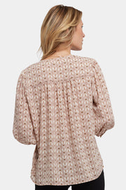 Bonnie Blouse by NYDJ is created from georgette with beautiful drape and has three-quarter sleeves, shoulder gathers and a back yoke with more gathers. Finished with a front button placket and button cuffs. This blouse's fabric is made with a sustainable polyester fiber created from 100% post-consumer plastic waste, resulting in less water and energy use and fewer greenhouse gas emissions without changing the look and feel of the fabric. The buttons are made with 50% post-consumer recycled polyester.