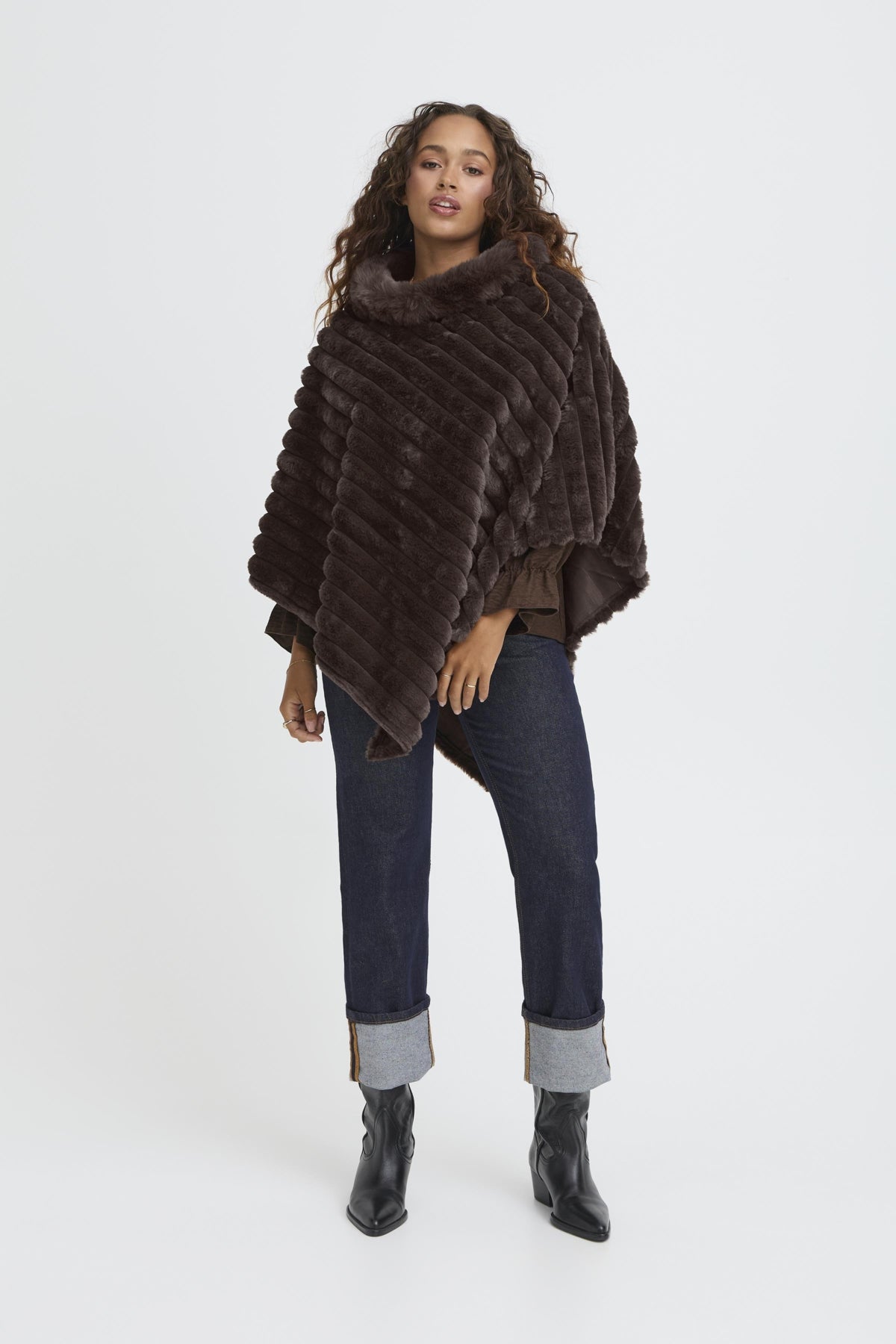 Indulge in luxe comfort with the Sorbet Danio Poncho in chocolate. This plush faux fur layer drapes beautifully over any ensemble, offering warmth without bulk. A versatile essential that brings understated sophistication to your seasonal wardrobe.