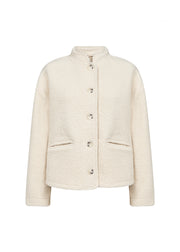 SC-SHAIMA 1 is a jacket made from 100% recycled polyester. It features a stand-up collar, button closure, and two front pockets with a textured finish. Pair it with denim or casual trousers for a relaxed look.