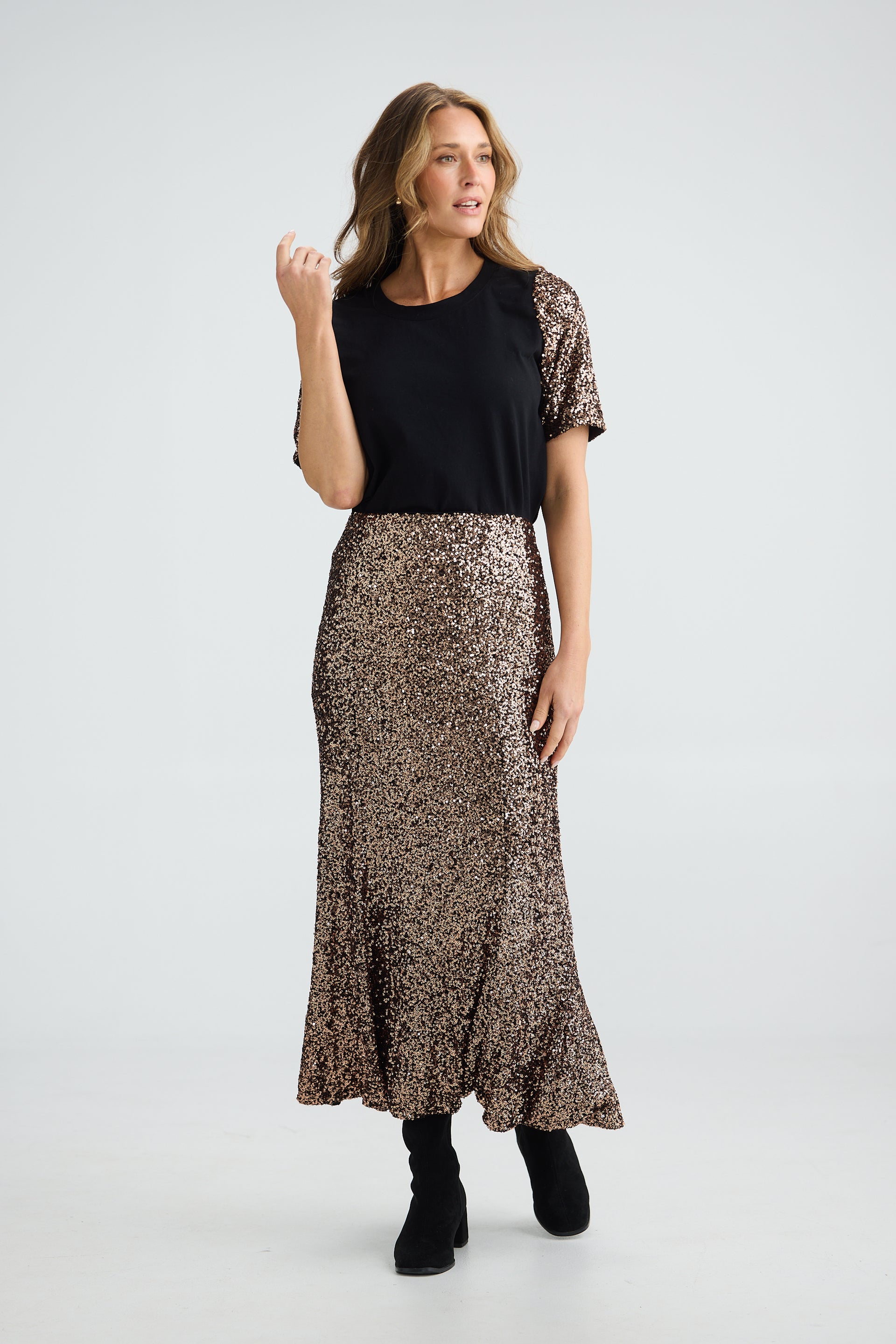 This Brave & True Ritz Skirt in bronze sequin combines dazzling style with comfort. Crafted from stretch sequin fabric and fully lined, it fits snugly through the hips and flares slightly at the hem for a flattering silhouette. The midi length and centre back zip add elegant finishing touches, making it perfect for standing out with confidence at any event.