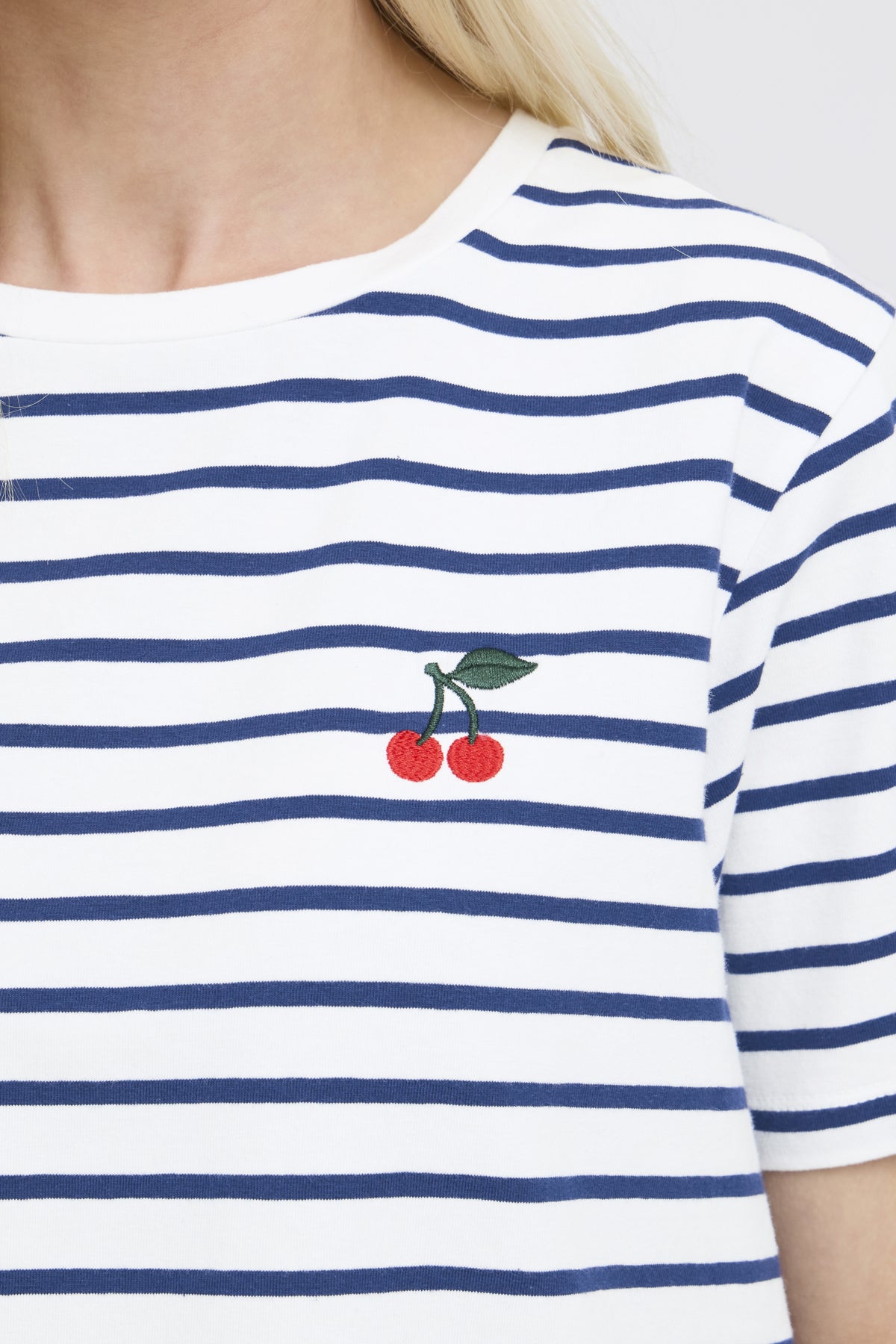 Fresh and playful, the B Young Pandinna T‑Shirt combines classic stripes with a charming embroidered cherry detail. Crafted in a soft cotton‑elastane blend, it offers breathable comfort with just the right amount of stretch for everyday wear.