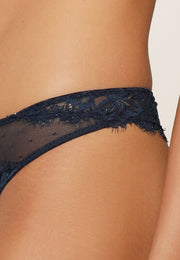 Sparkling Blue! This beautiful lace thong is semi-transparent at the front and features a delicate glitter detail in the lace trim at the back. The elegant charm at the front adds a refined touch to the design.