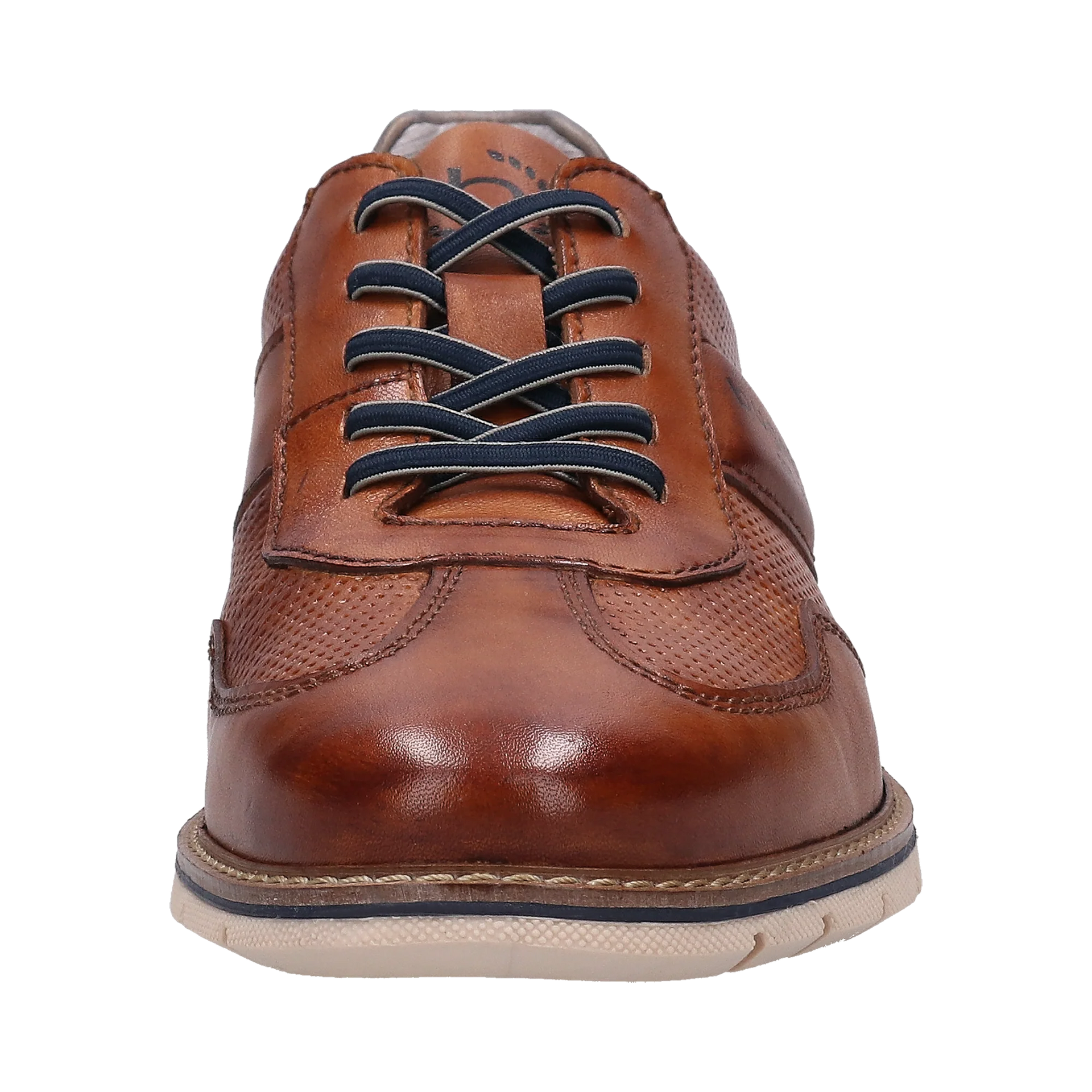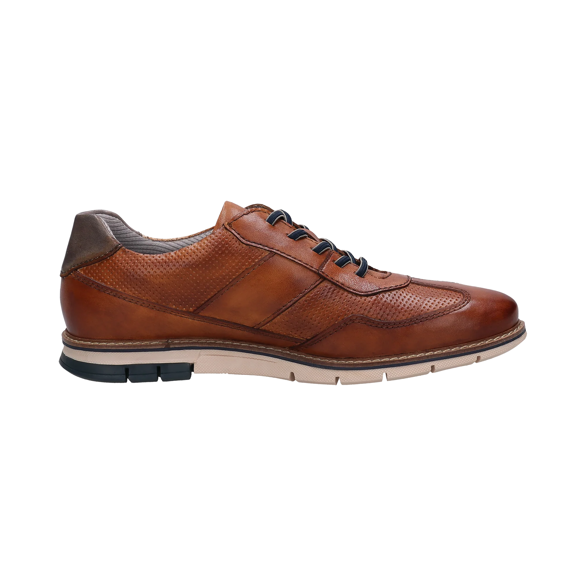 Built on a thin flexible sole, these bugatti men trainers in cognac leather with a Hand Finish look, are completed by a mix of grey on the upper heel and dark blue laces. Featuring the logo on a leather ribbon band and added some perforations for breathability.