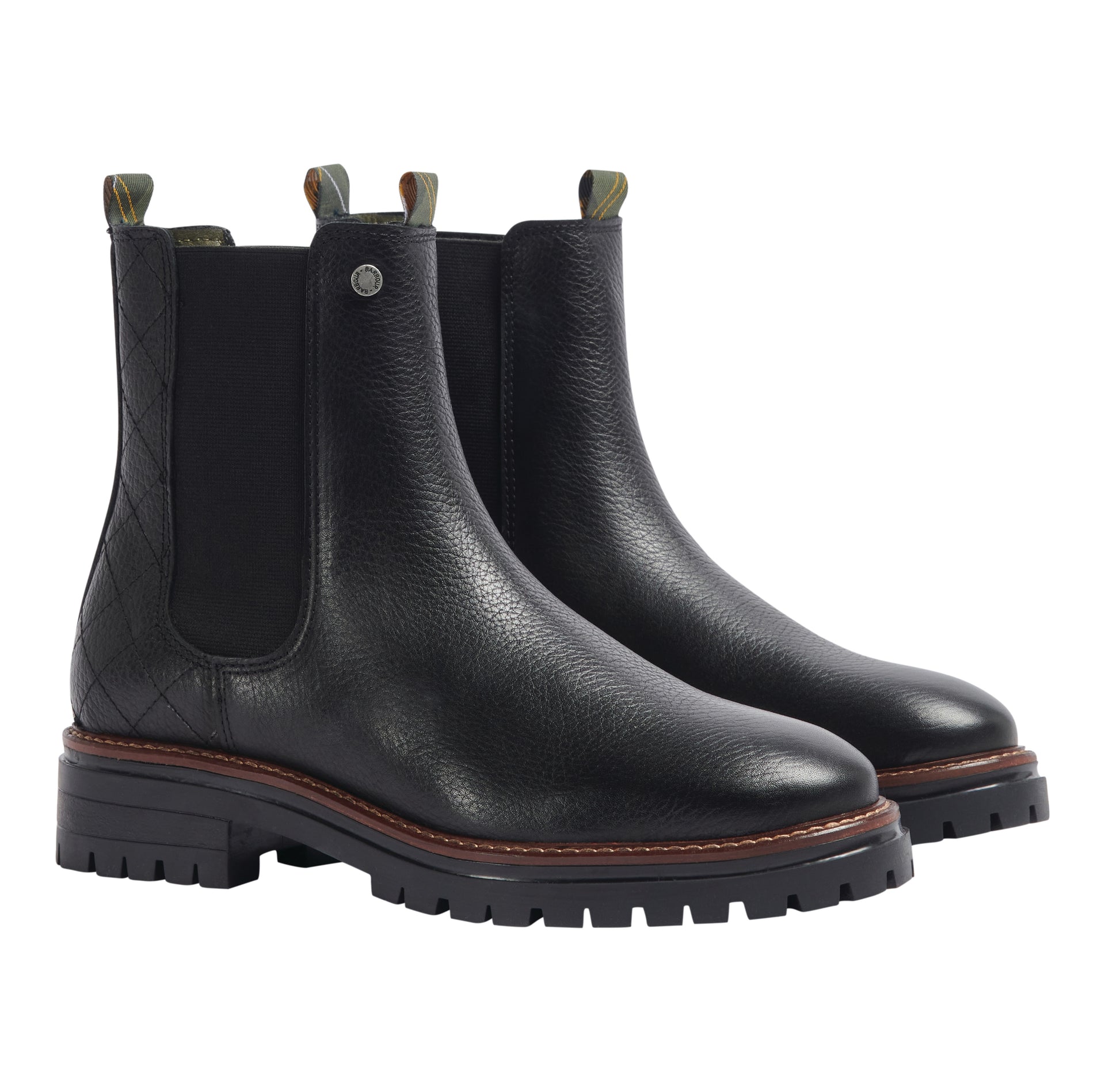 An elongated Chelsea boot set on a lightweight cleated sole. Features diamond quilt stitch detailing and a classic tartan pull loop.