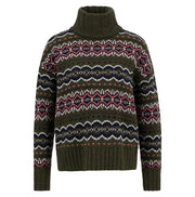 All over Fairisle jumper with a chunky roll neck in a relaxed drop shoulder block. Features solid colour hem, cuffs and neck trim.