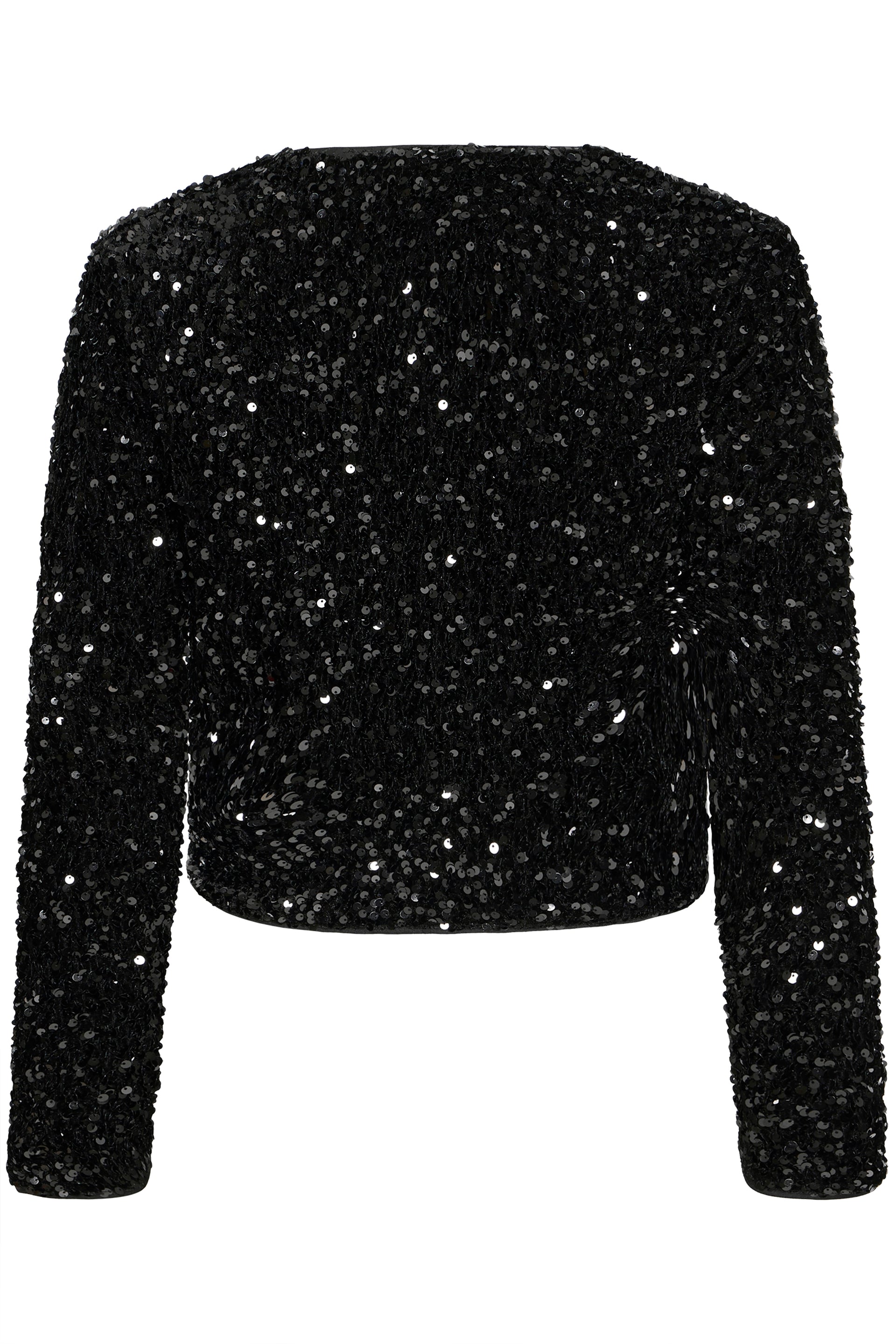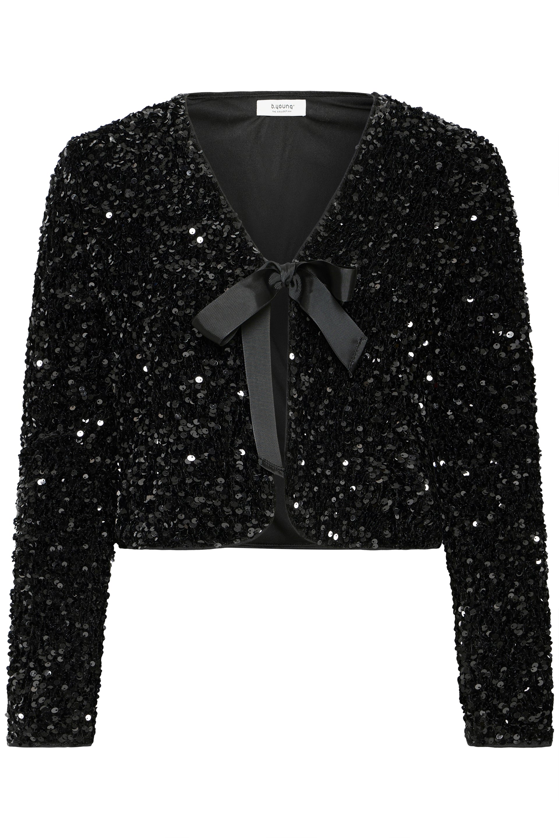 Add a touch of sparkle to your party wardrobe with the B Young Paillet V-Neck Bow Jacket in Meteorite Black. This short-length jacket features a dazzling red sequin design that catches the light beautifully, perfect for festive occasions. The elegant V-neck and charming bow detail create a flattering silhouette, making it an ideal choice to shine at any celebration.
