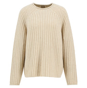 Grown on funnel neck knit in moss stitch with fashioned ribs at raglan seams. Features roll edge at neck opening and cuff edge, relaxed shape sleeve and full needle stripe at centre back.