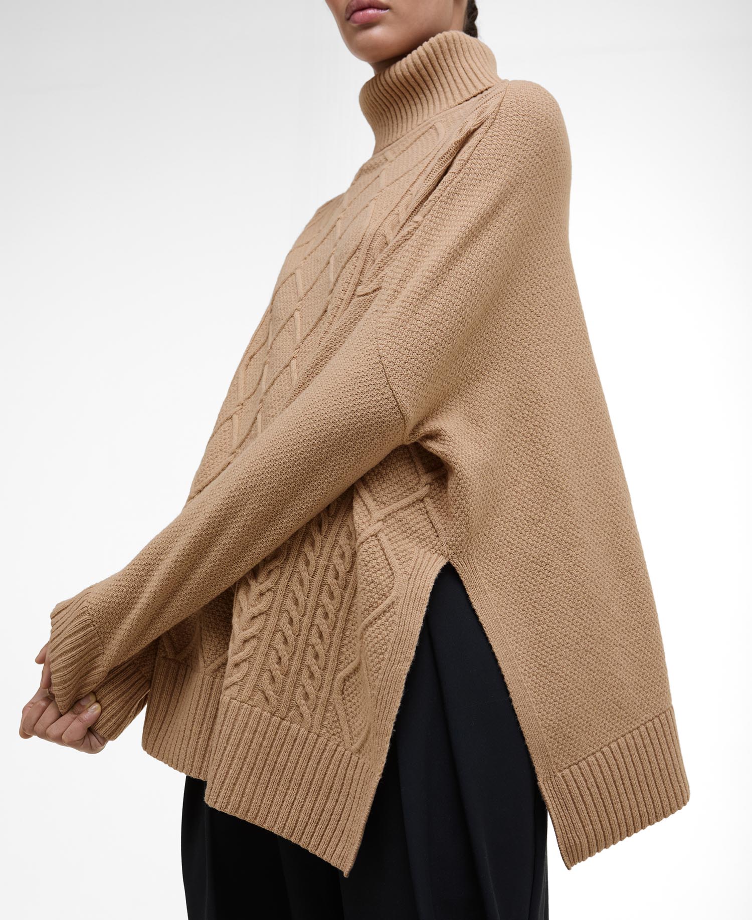 The Barbour Burne cape is imagined in a warm wool-blend fabric with a roll neck and long sleeves. It’s detailed with an argyle-inspired cable knit, making it a stylish option for updating casualwear looks.